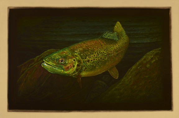 Alberto Rey catskill P 72 dpi Biological Regionalism: Brown Trout, Willowemoc River, Catskills, New York I Oils on Plaster 19″ x 33″ $2600