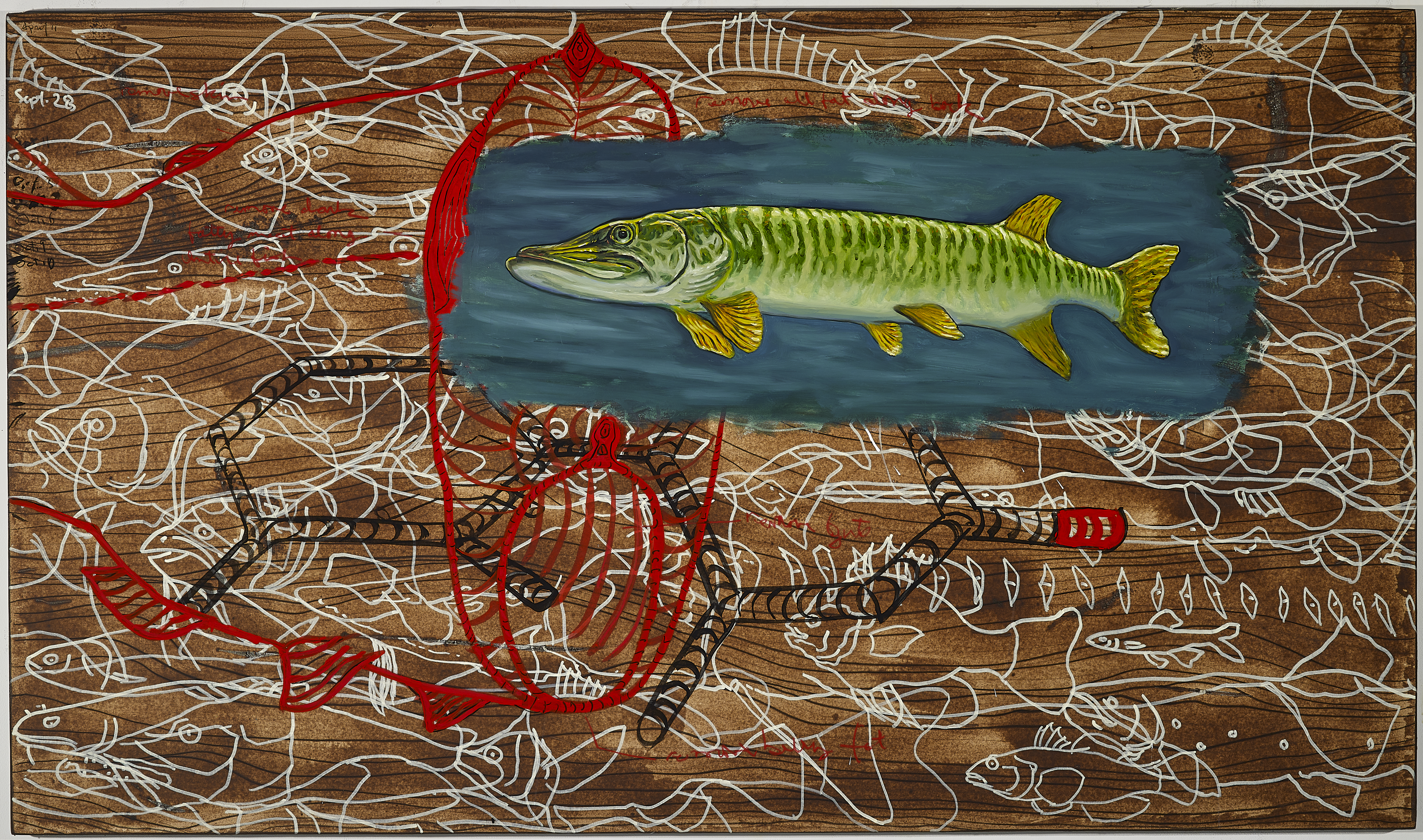 This solo exhibition at The University of Buffalo is a continuation of his Biological Regionalism series in which he attempts to re-establish a connection to local landscapes and wildlife by documenting fish species found in bodies of water near the exhibition venue through video and traditional piscatorial painting. This exhibition examines Ellicott Creek located on the edge of UB’s north campus. The underwater source material for the paintings and large-scale projections captures the opalescent colors and balletic movements of largemouth bass during their annual migration and the constantly moving and changing environment where they are found. The three videos document the environment above the water, in the stream and the stream bed below the migrating largemouth bass. A publication of process and artwork was published.
